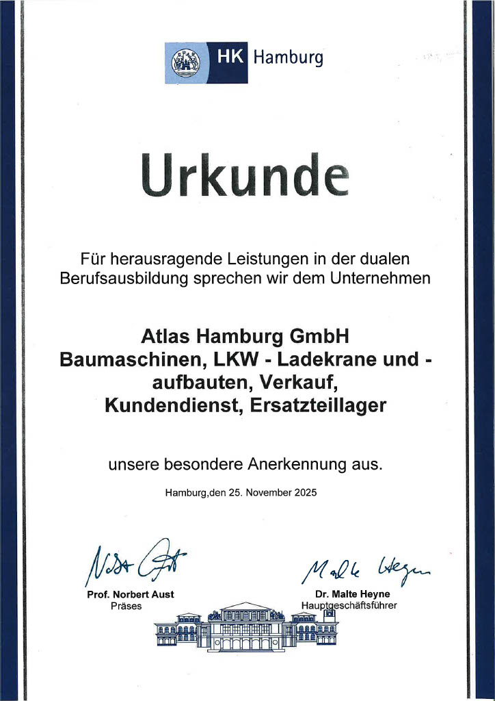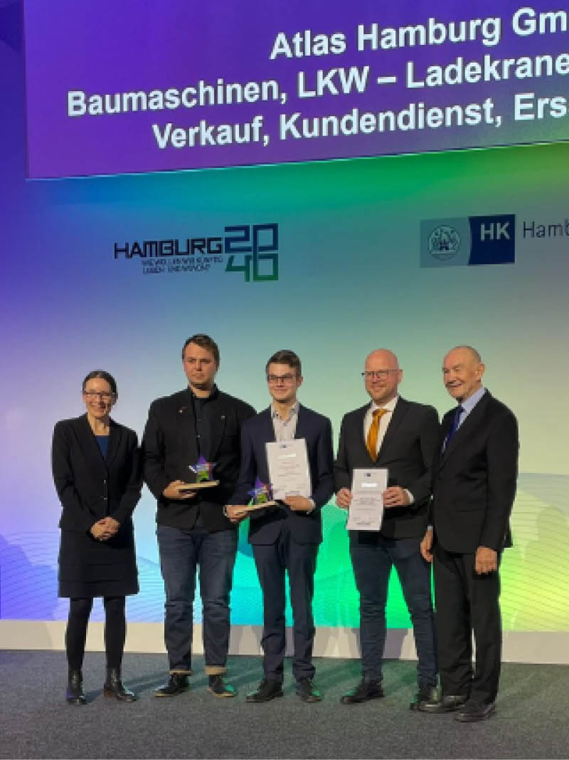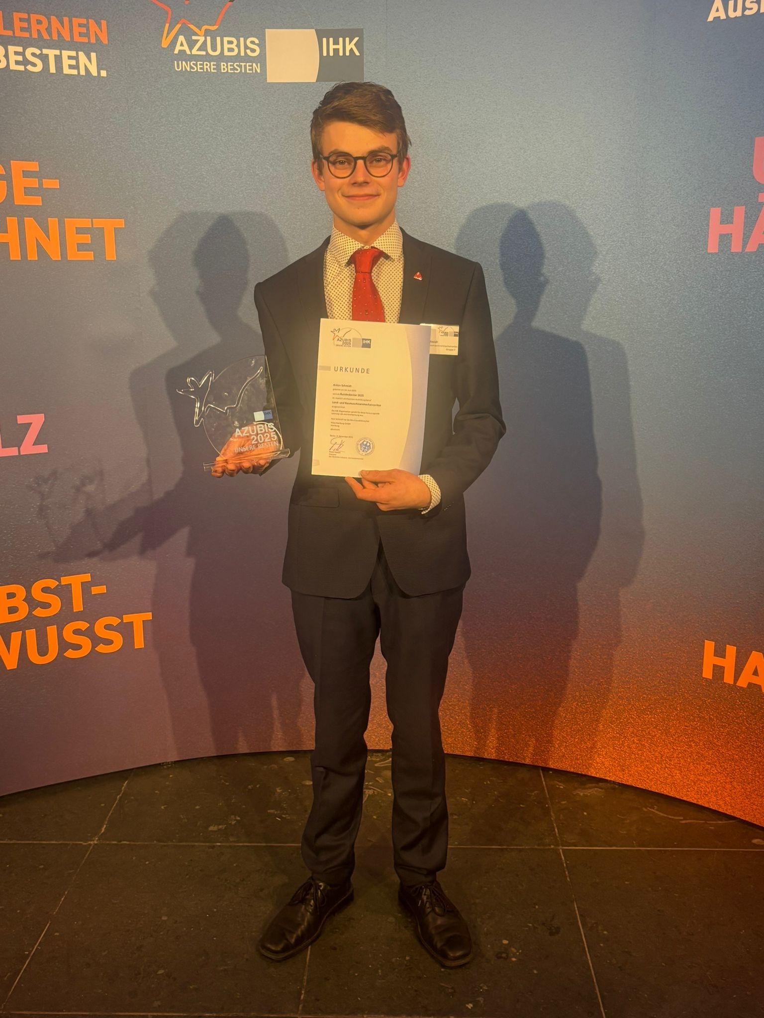 Die Hamburger Wirtschaft hat in diesem Jahr wieder die besten Azubis geehrt. Anton Schmidt (20), der bei der Atlas GmbH in Billbrook eine Ausbildung zum Land- und Baumaschinenmechatroniker absolviert hat, ist dabei und freut sich über diese hohe Auszeichnung. Die Ausbildungszeit von 3,5 Jahren konnte Anton Schmidt aufgrund seiner guten Leistungen auf drei Jahre verkürzen. Er erreichte 96 Prozent und erzielte damit das beste Ergebnis in seinem Ausbildungsberuf.