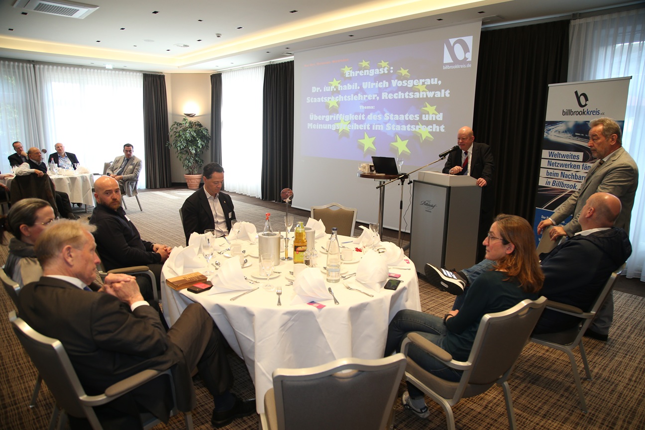Bernhard Jurasch, der Erste Vorsitzende des Billbrookkreis e.V., begrüßte die zahlreichen Gäste herzlich zum 126. Treffen des Billbrookkreises im Hotel Böttcherhof, darunter den Ehrengast Dr. jur. habil. Ulrich Vosgerau, der zum Thema „Demokratie und Meinungsfreiheit“ referierte.