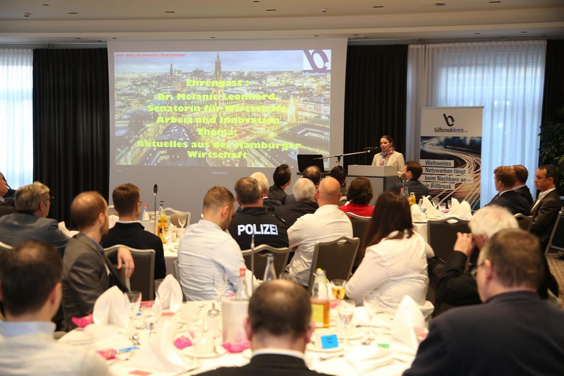 Zum Jahresabschlusstreffen im Hotel Böttcherhof begrüßte der Erste Vorsitzende des Billbrookkreises, Bernhard Jurasch, als Gastrednerin Dr. Melanie Leonhard. Die Senatorin der Behörde für Wirtschaft, Arbeit und Innovation der Freien und Hansestadt Hamburg sprach über „Aktuelles aus der Hamburger Wirtschaft“.