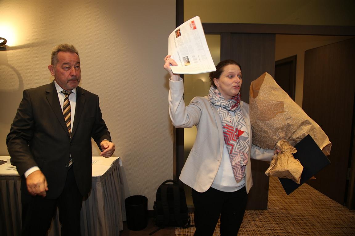 Mit einem bunten Blumenstrauß bedankte sich Bernhard Jurasch bei der Wirtschaftssenatorin Dr. Melanie Leonhard für ihren tollen Vortrag. -
